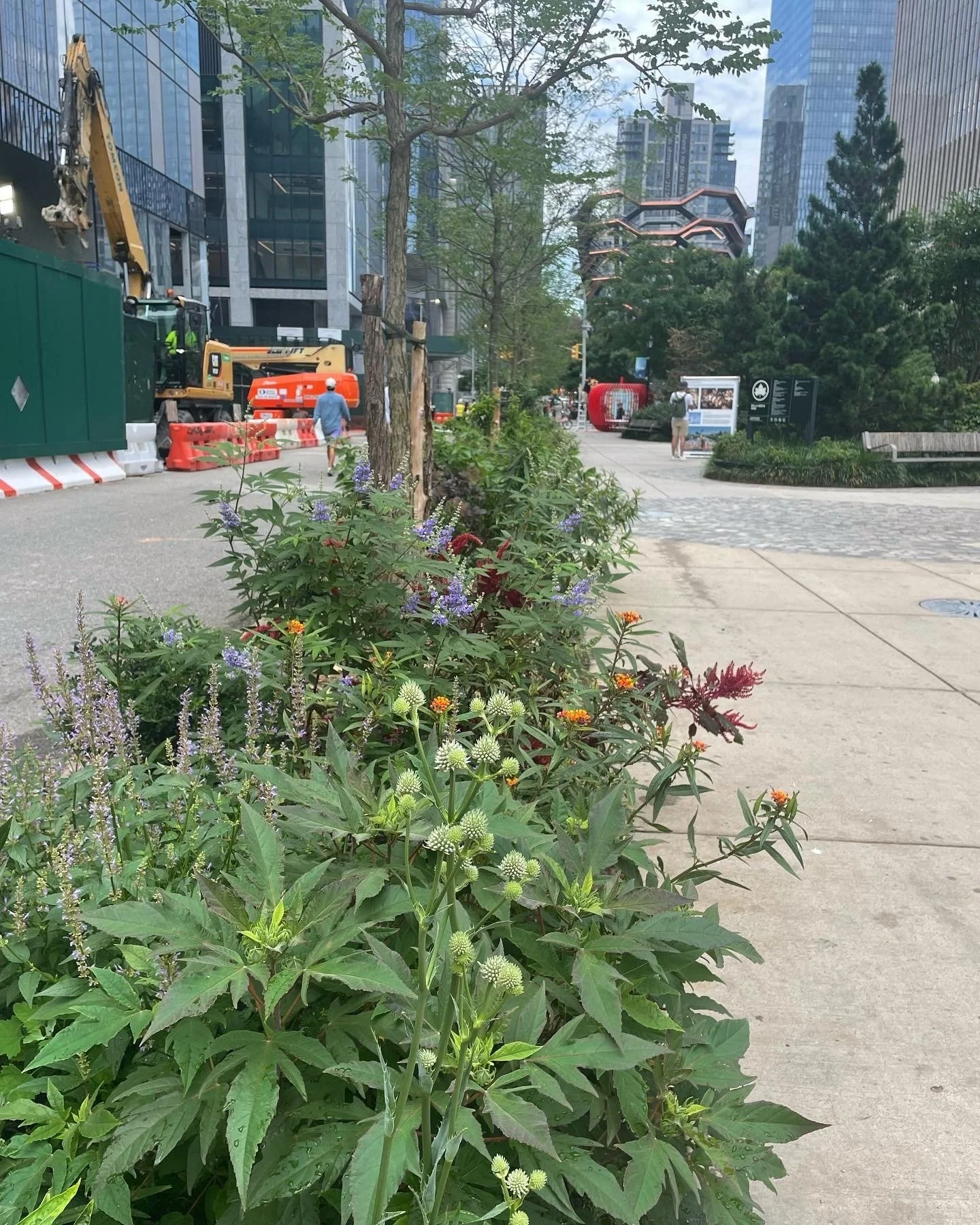 We call these tough public plantings Sidewalk Gardens or Side Meadows. We have planted a wide variety of native plants alongside and in the middle of heavy foot, bus, and dog traffic, homeless populations, and under high wind conditions. We are cultivating the beauty of the natural world into unexpected spaces, as stewards of nature. We have found tons of pollinators, song birds, and butterflies right here at the edge of our urban world. And if we can create ecologically rich landscapes on the streets of Hell’s Kitchen we can do it anywhere. We love you, NYC!